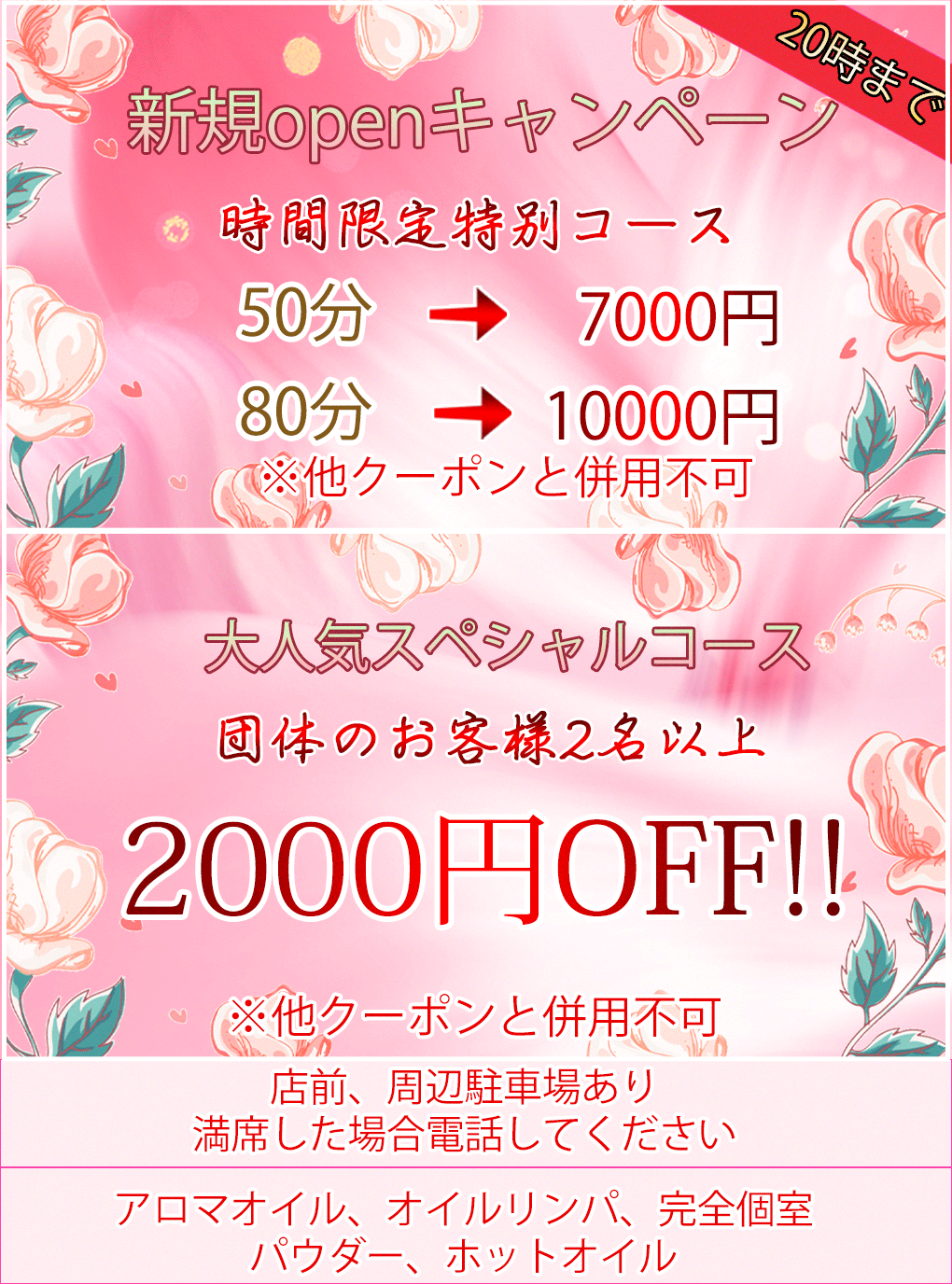 当店では、アロマオイルの効能と当店自慢のセラピストによるリンパマッサージの相乗効果による、癒しのひとときをお客様お一人お一人にお届けしております、自然で心やすらぐ優美な香りを、施術中はもちろんご帰宅お休みになってから翌日朝目覚めでまで楽しんで頂けます、どうぞゆっくりご堪能ください。
